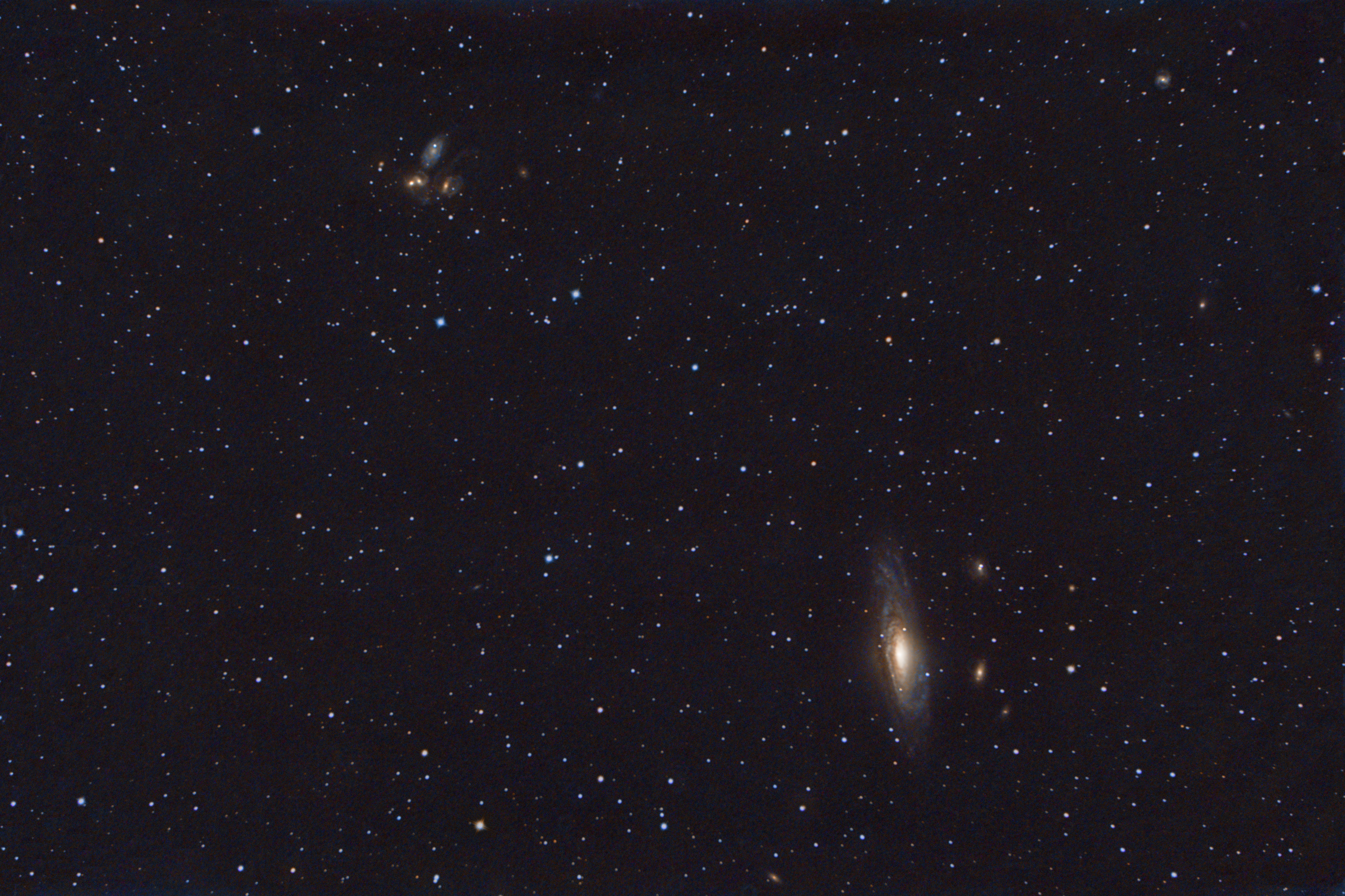 Een combinatie foto van het sterrenstelsel NGC7331 en de kleinere cluster NGC 7320 (Stephan’s Quintet). Maar als je goed kijkt zijn er nog veel meer sterrenstelsels te zien, deze zijn te onderscheiden van gewone sterren doordat ze er wat waziger uitzien. Anders gezegd het lijkt een vage ster in een wolkje.
